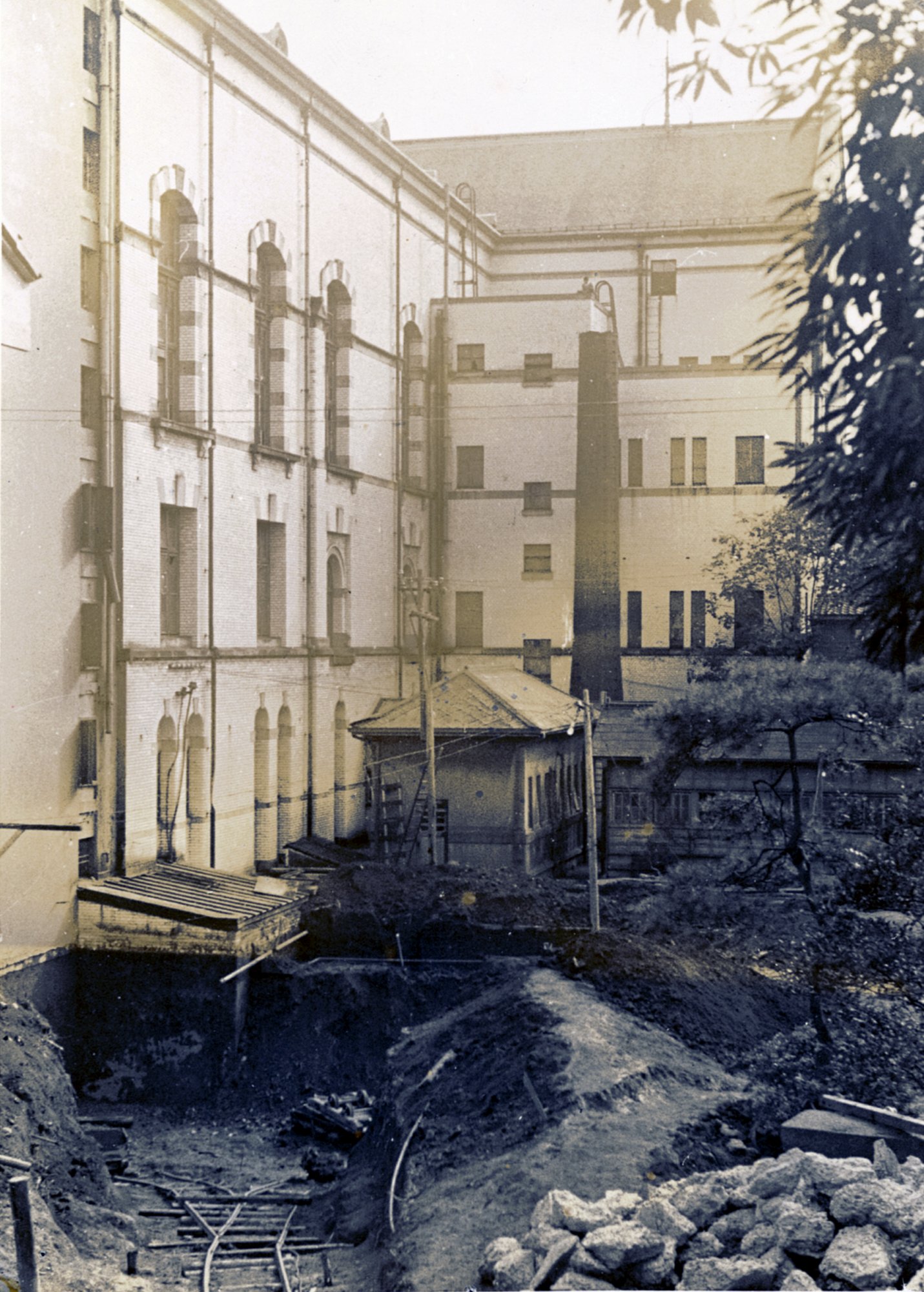 旧コンクリート造書庫の増築工事中の様子です。土などを運ぶための軌道が見えます。正面に見える建物は旧木造書庫です。