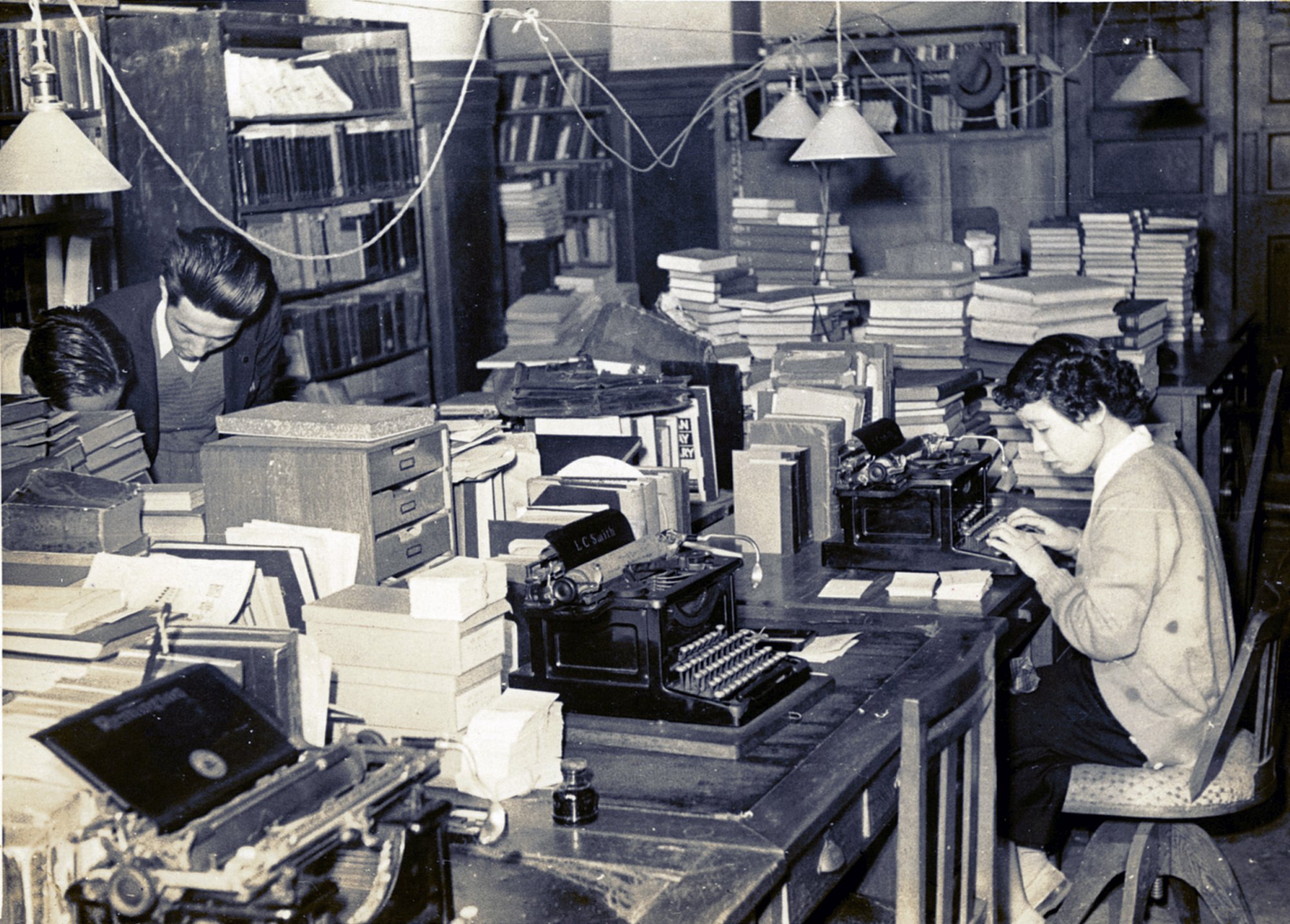 戦後の事務室の様子です。送られてきた資料が机上に並び、整理を待っています。
