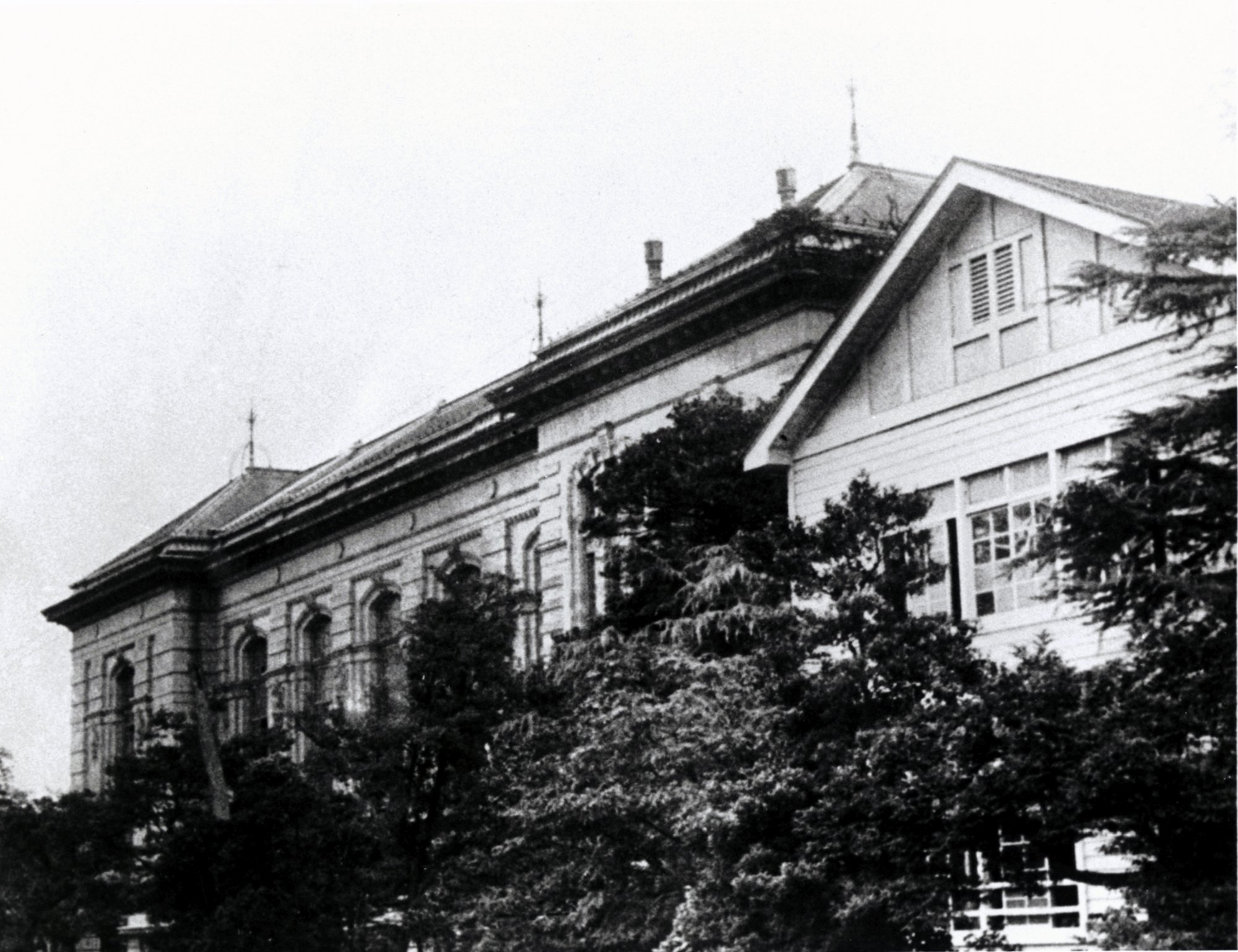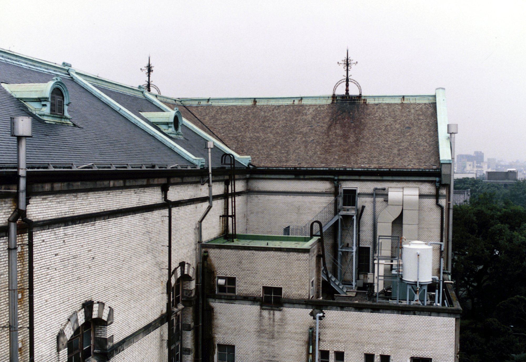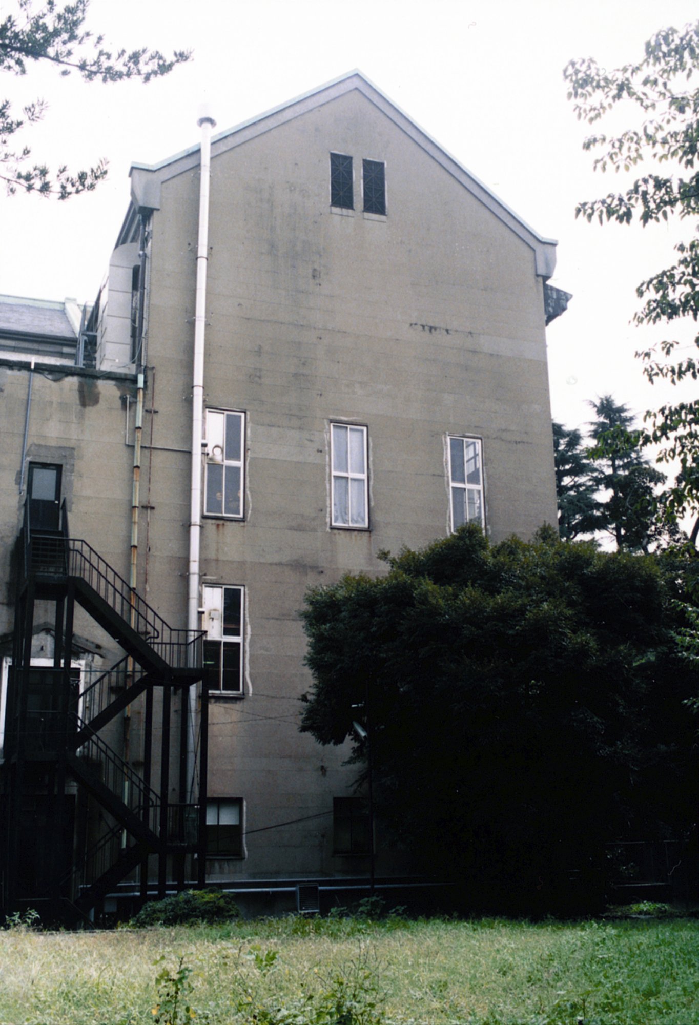 右手前は旧コンクリート造書庫です。中央下部に見える屋根の跡は旧木造書庫(通称:安川書庫)への通路跡です。