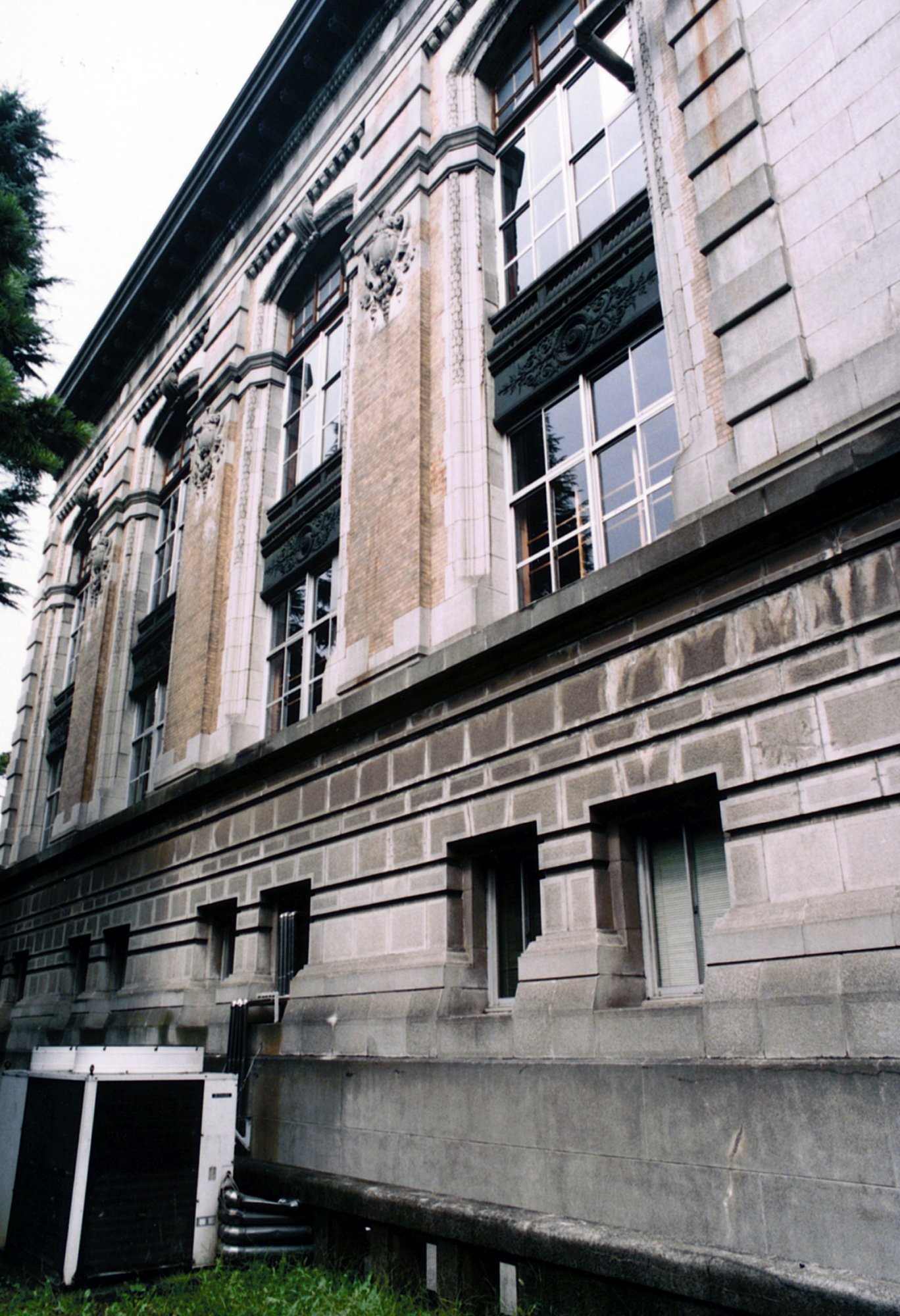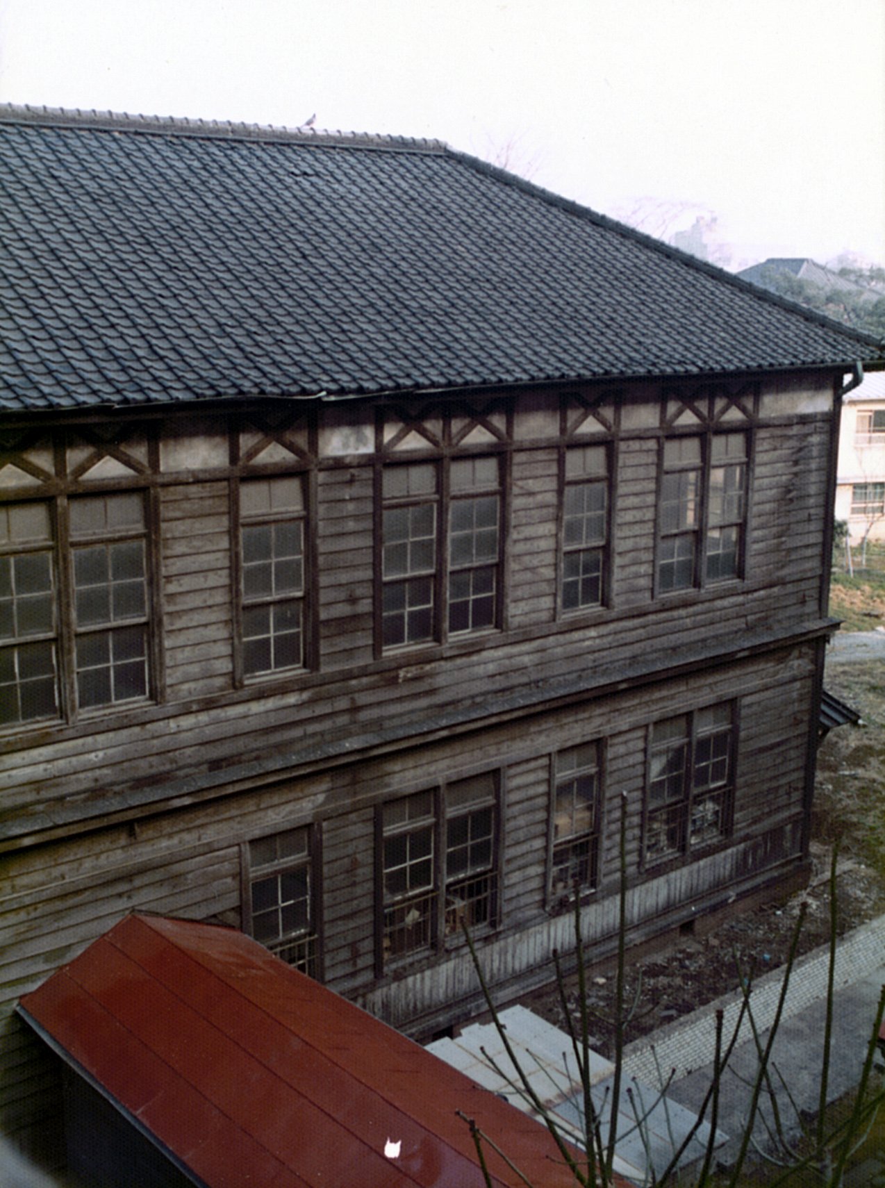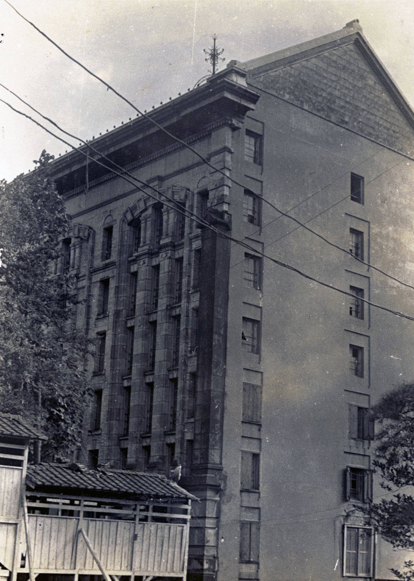 右手前は旧コンクリート造書庫です。中央下部に見える屋根の跡は旧木造書庫(通称:安川書庫)への通路跡です。