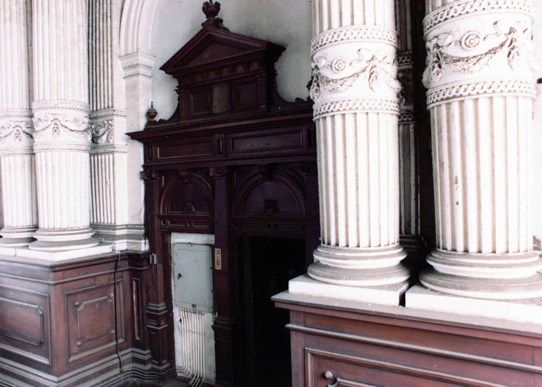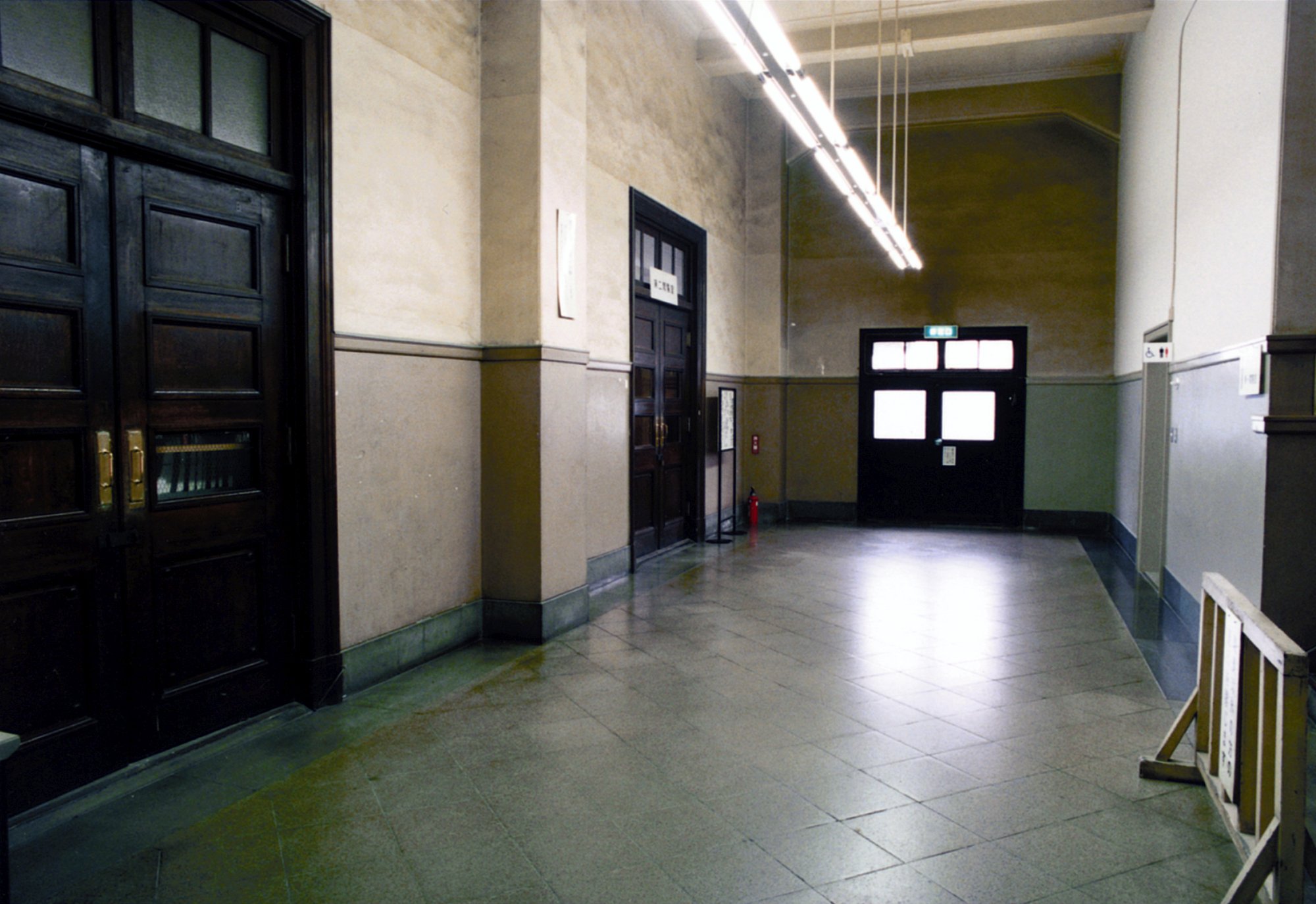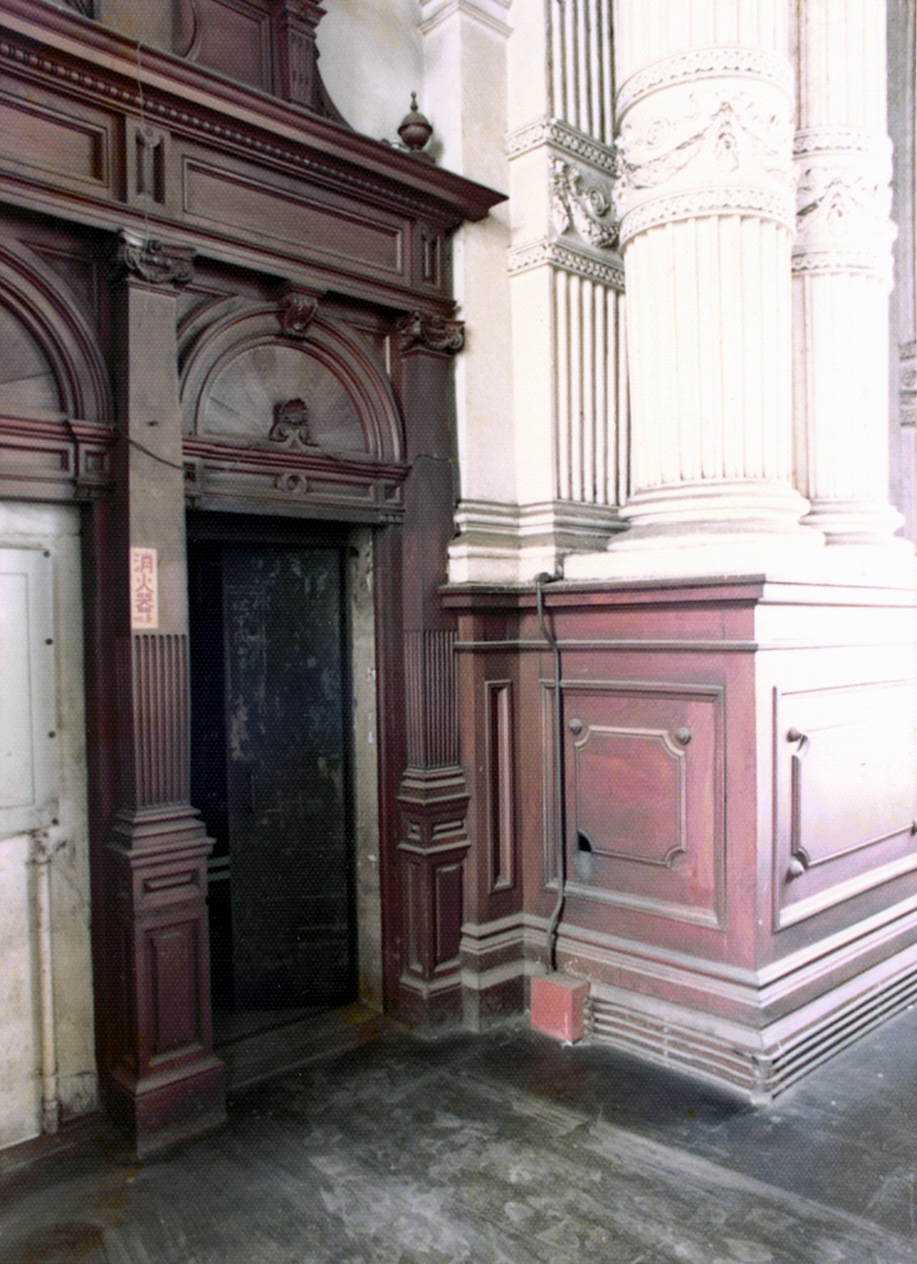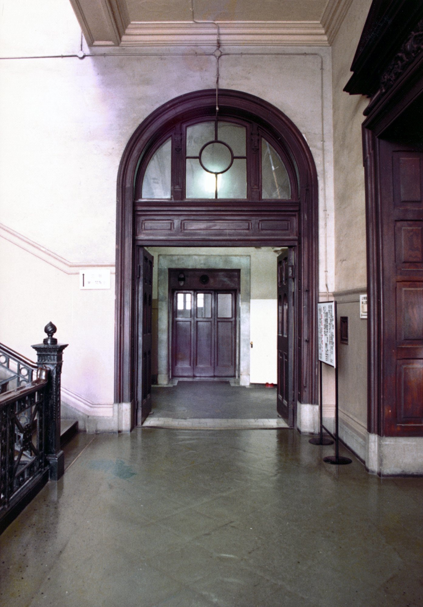 大階段2階部分。正面に見えるのは3つ扉で片開きのエレベータです。現在は撤去され、新しいエレベータが設置されています。