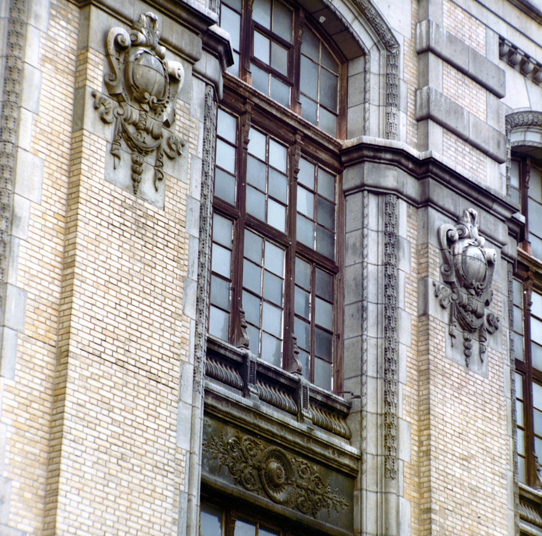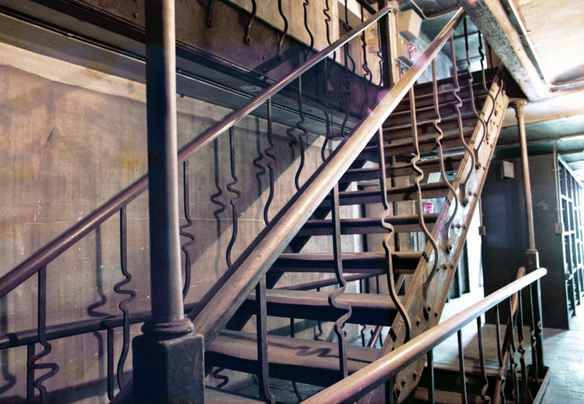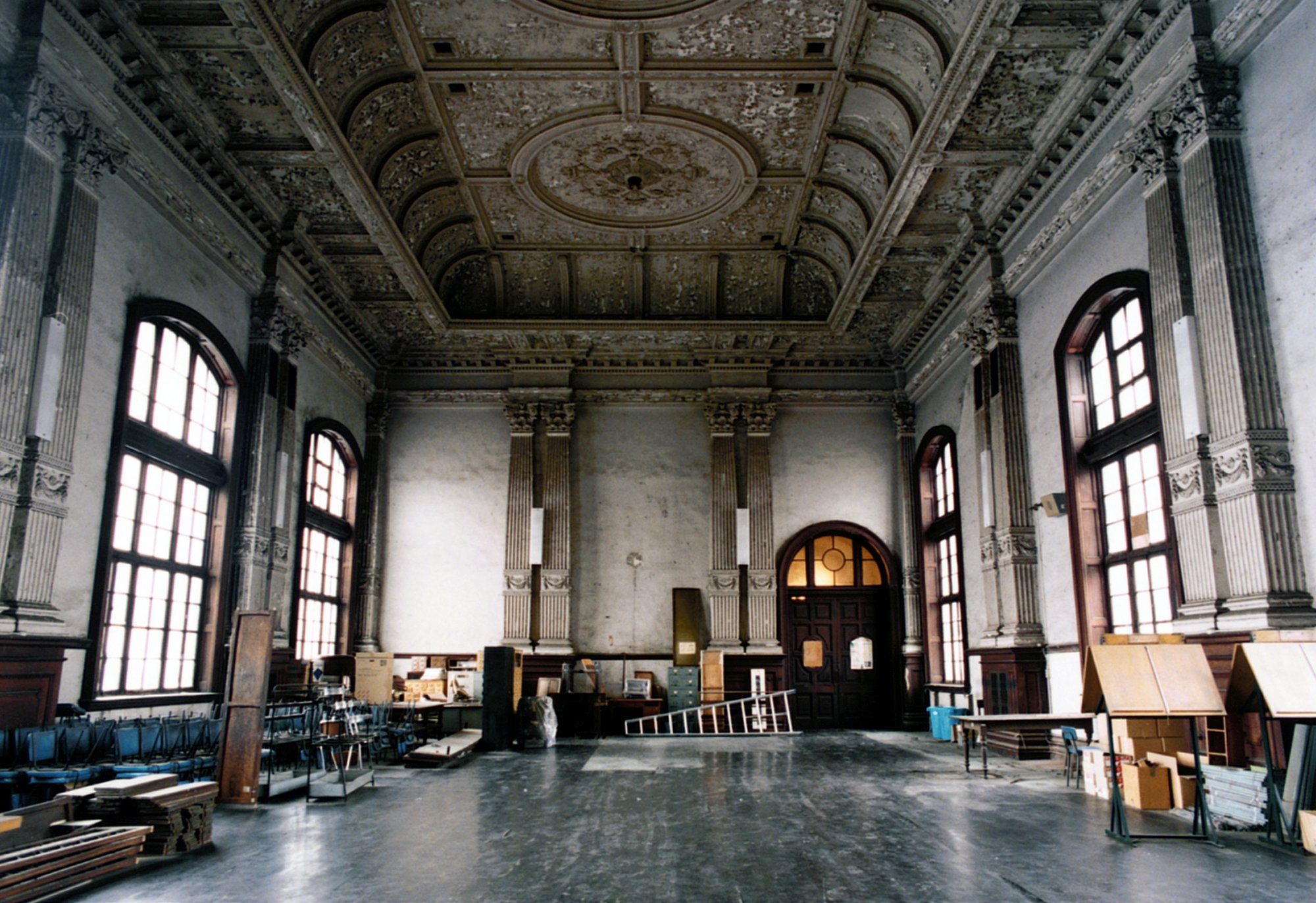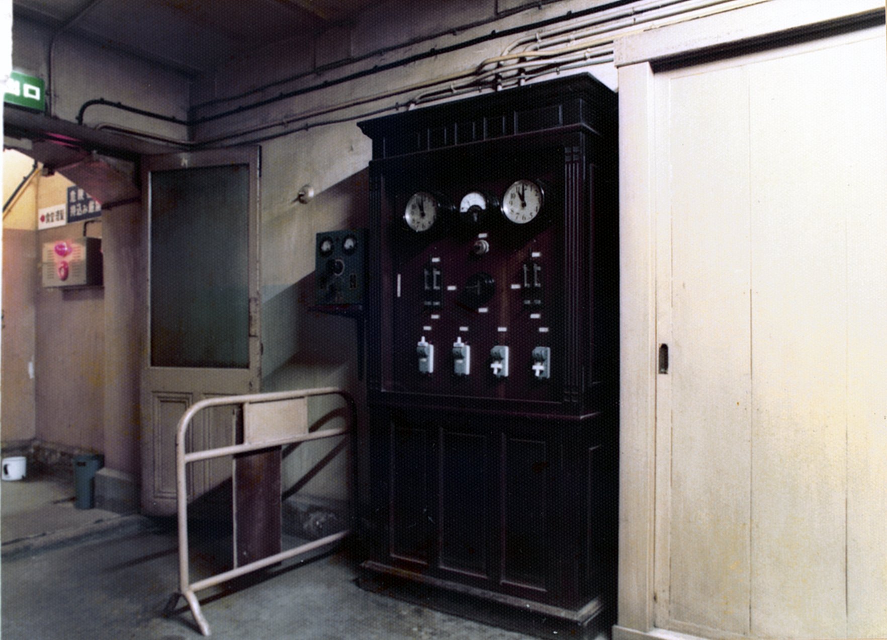 大階段2階部分。正面に見えるのは3つ扉で片開きのエレベータです。現在は撤去され、新しいエレベータが設置されています。