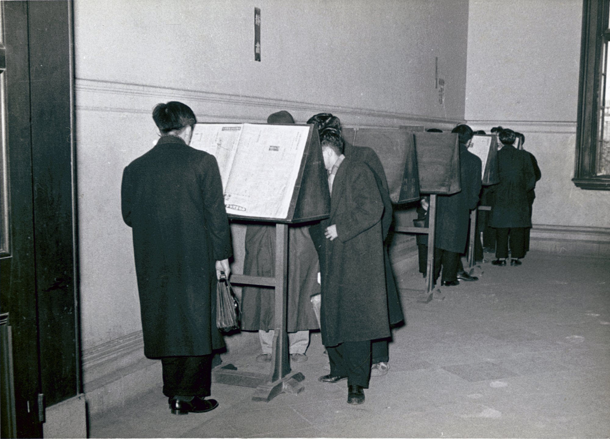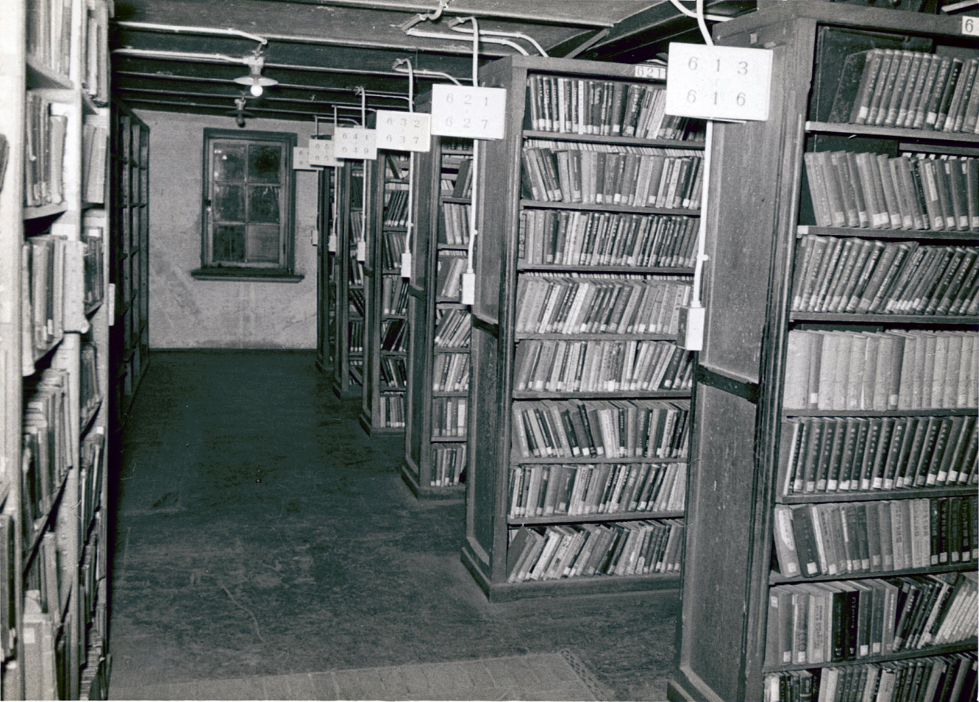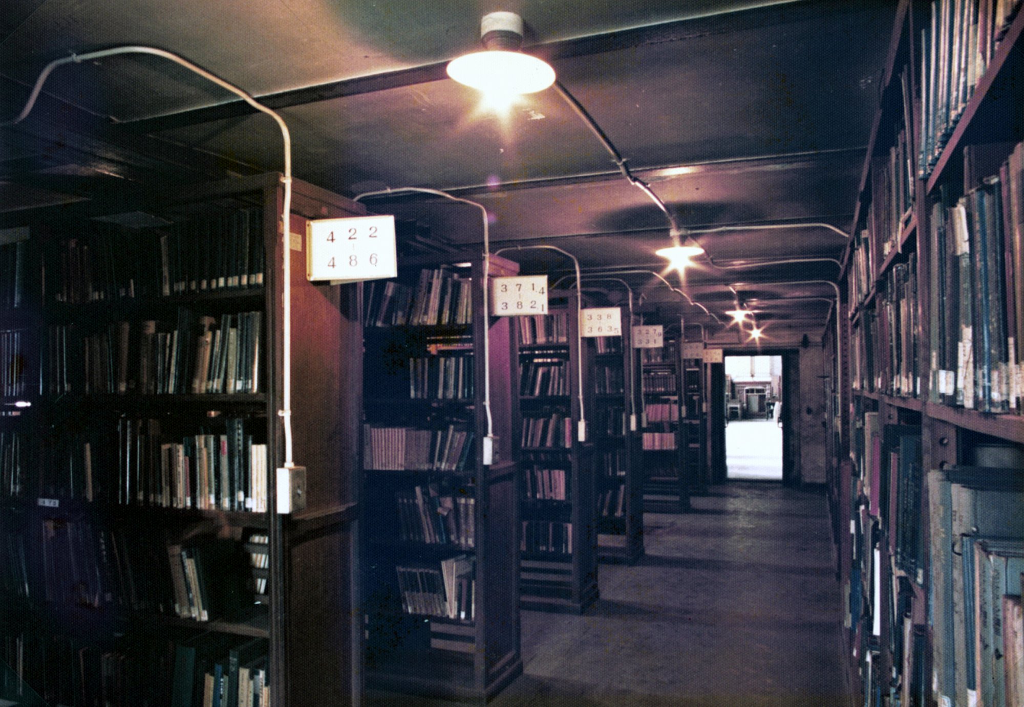 戦後の一時期は閲覧スペースとして使われていました。奥にある書架には金網が張ってあり利用者は職員に申し出た上で資料を利用していました。職員の間では「セミオープン」と呼ばれていた配架方法です。
