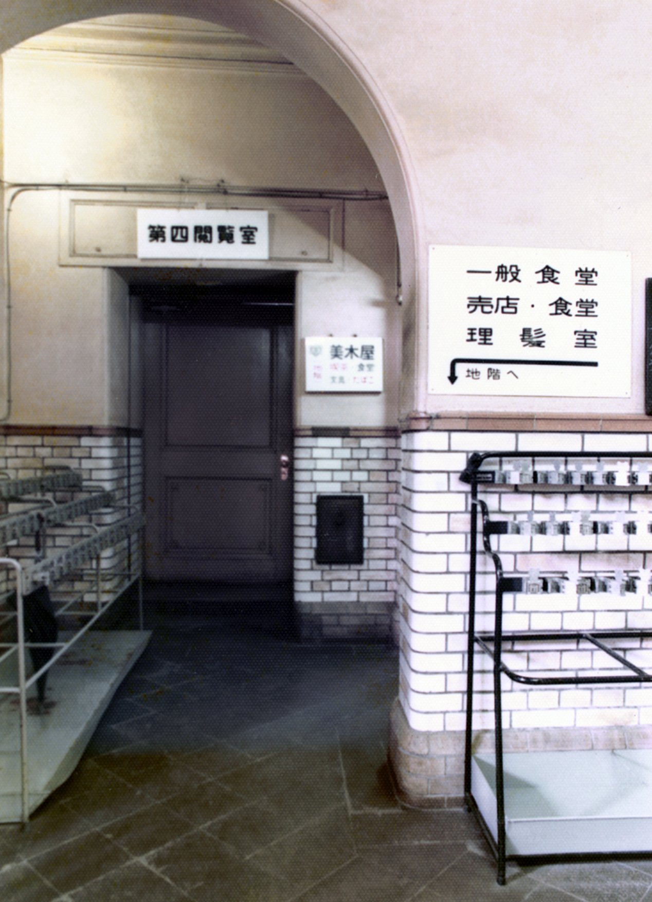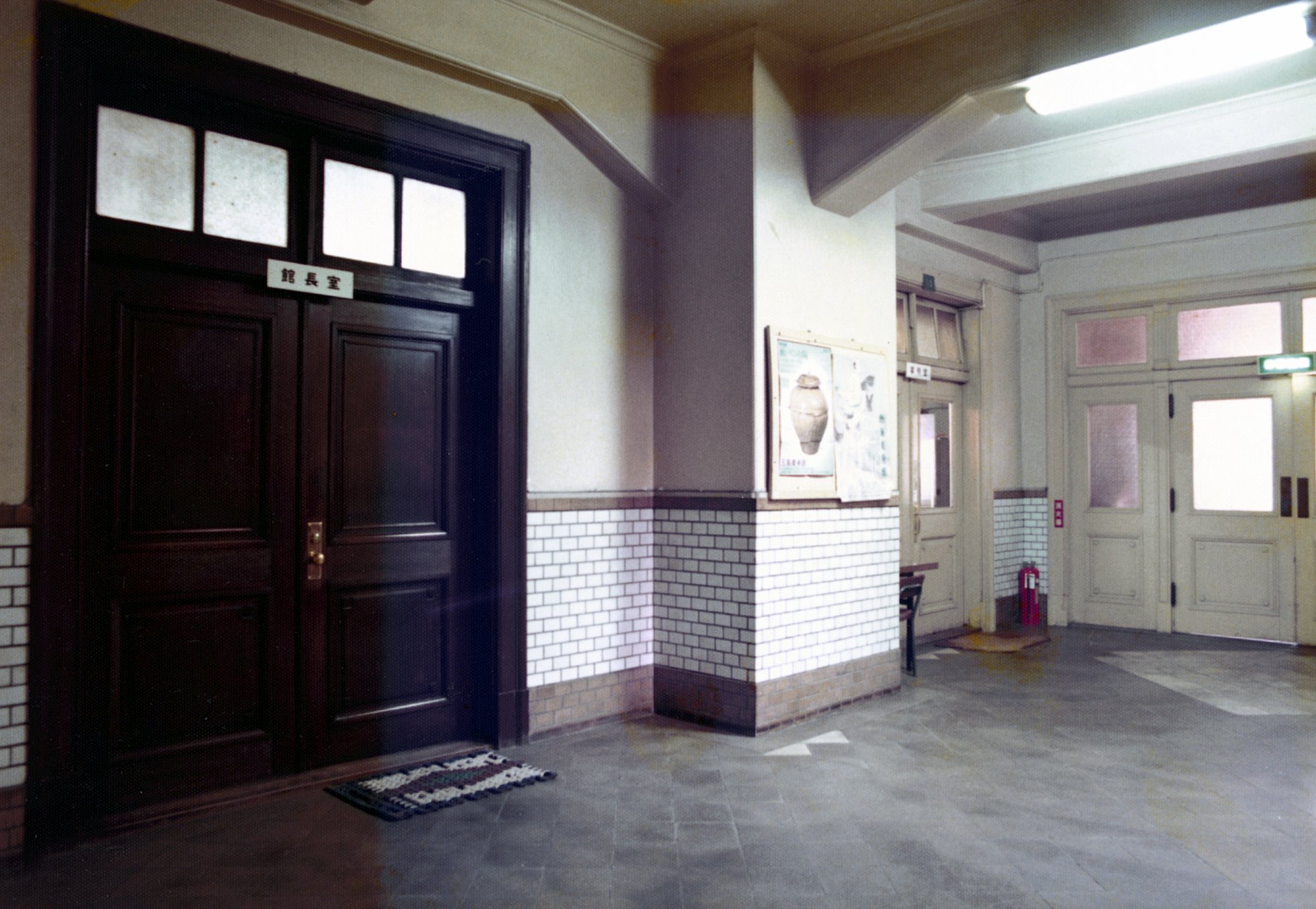左側に現在の1階休憩・飲食・授乳スペース付近にあった館長室の扉が見えます。この廊下は平成の改修工事で撤去されました。
