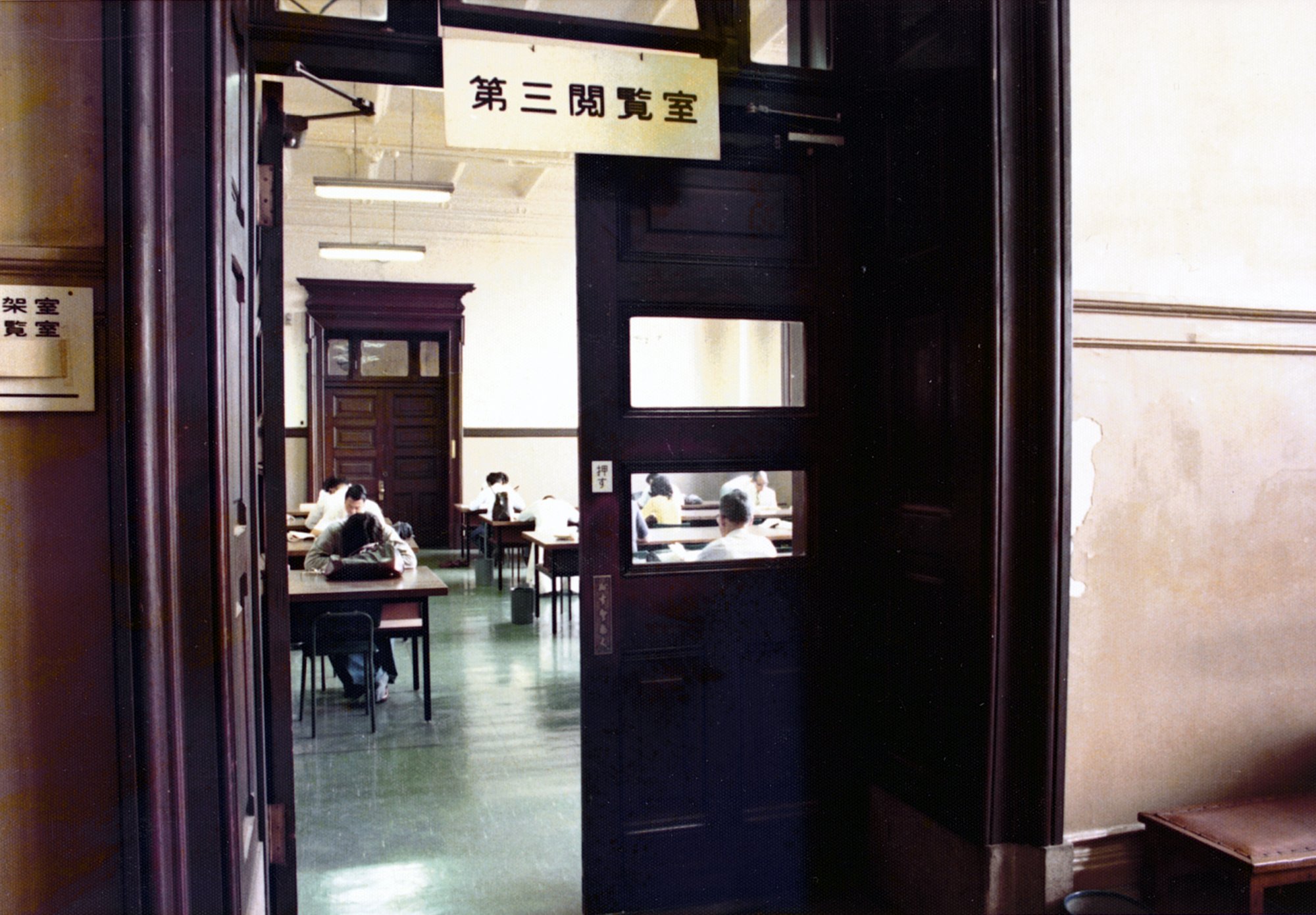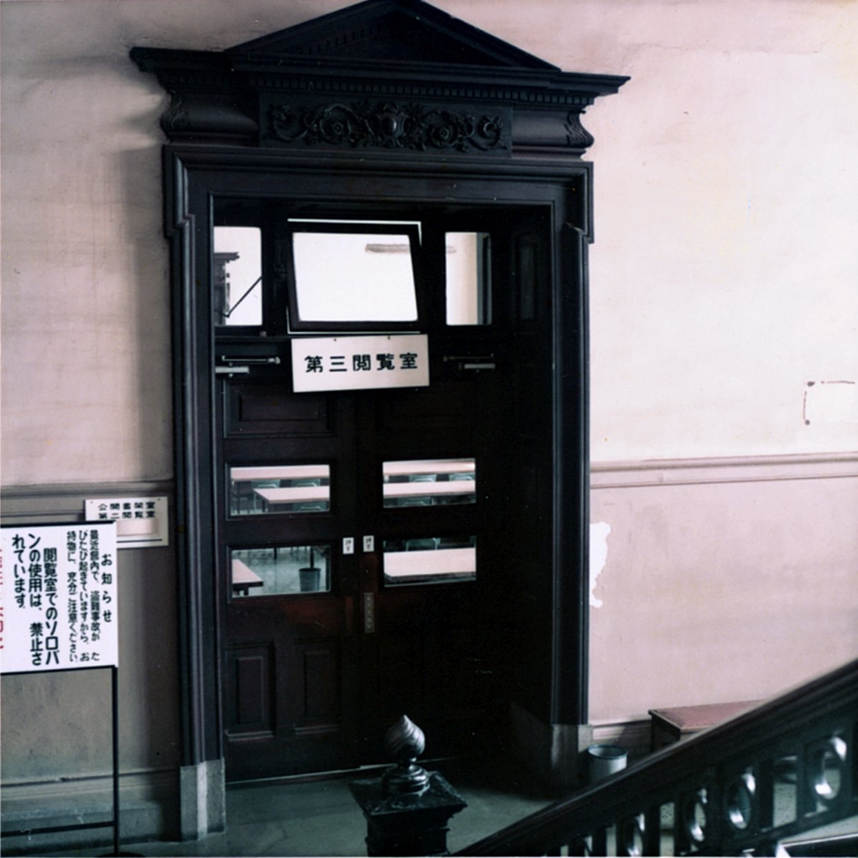 撮影当時の第三閲覧室への入り口です。左側には「ソロバンの使用禁止」など時代を感じさせる掲示が見えます。