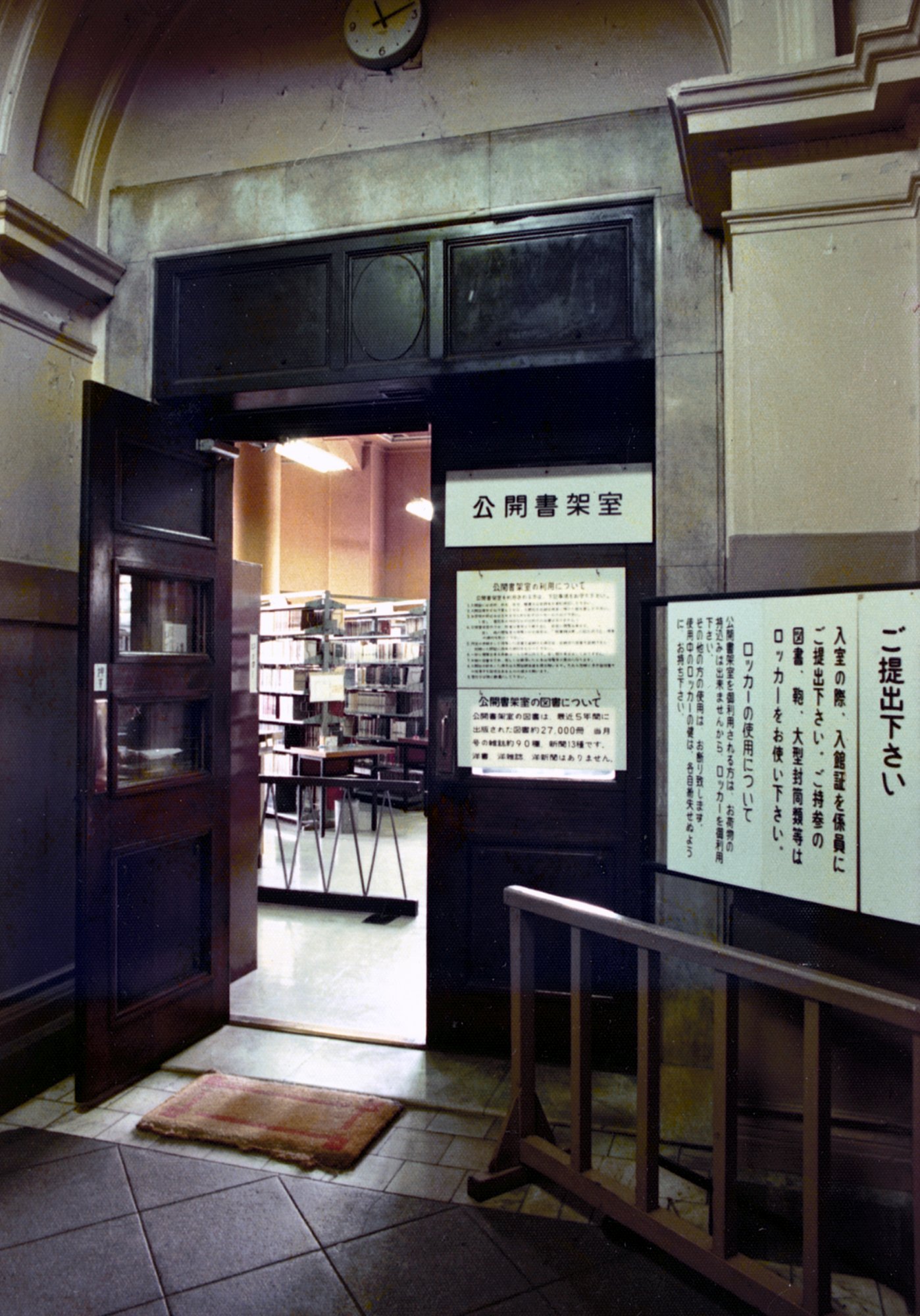 2階廊下から撮影した当時の公開書架室の写真です。現在では調べものの部屋として利用されています。