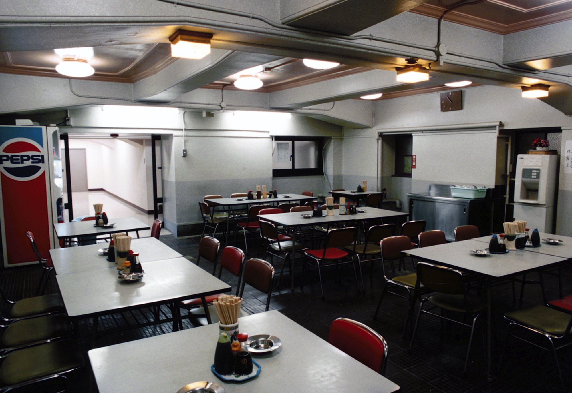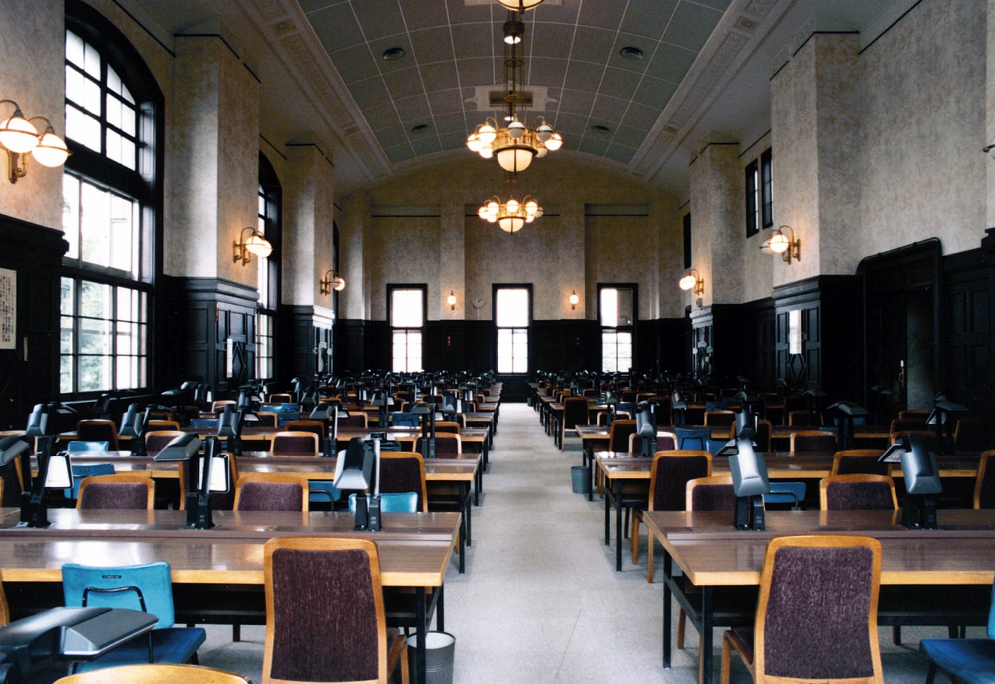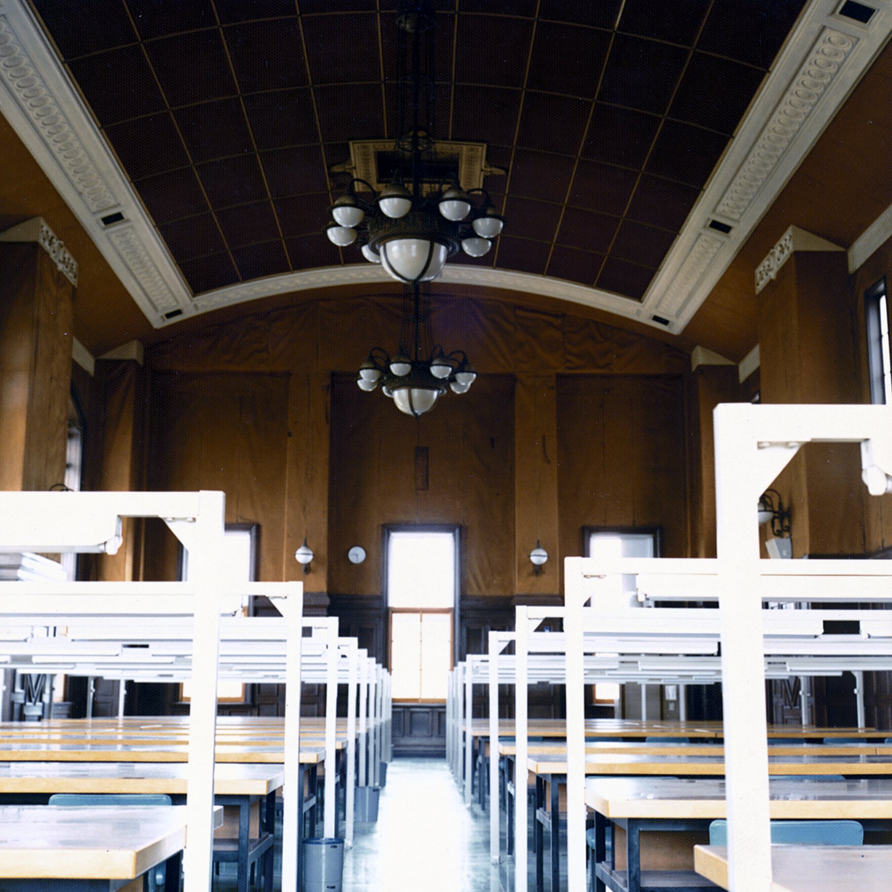 昭和の後期にはこのような机が設置され、閲覧室として利用されていました。天井が高いために、明るさを確保する目的で蛍光灯が机に固定されています。