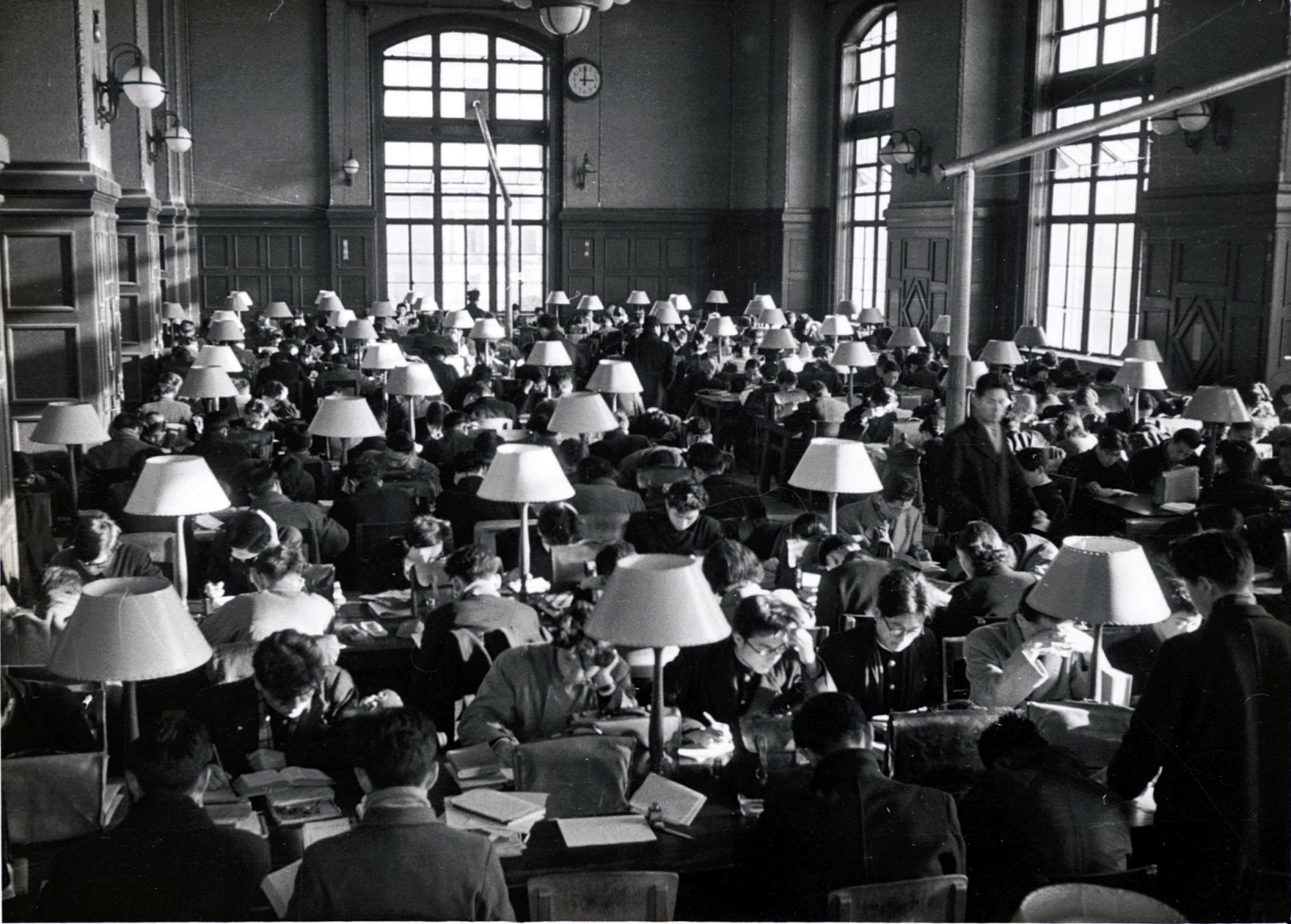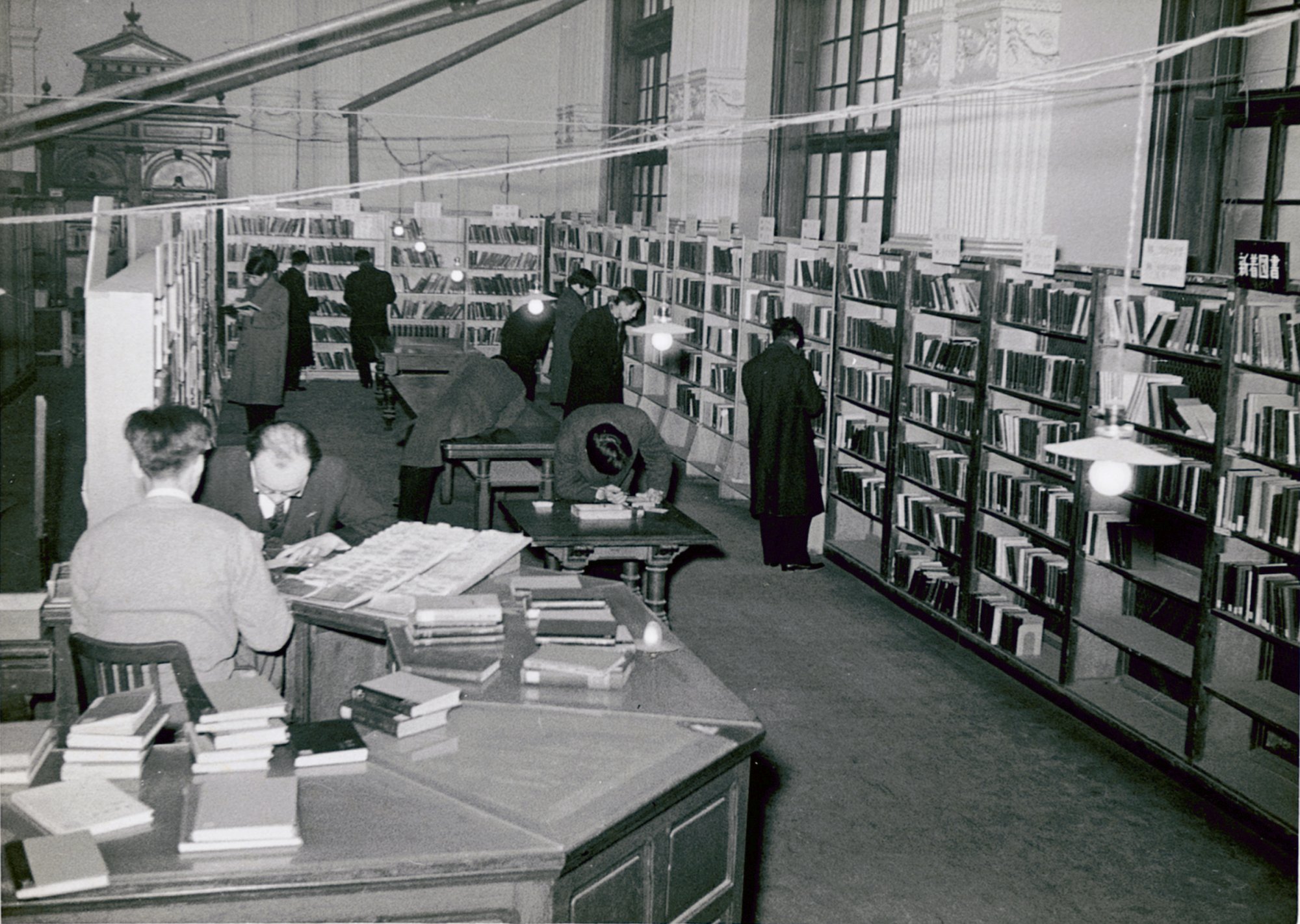 戦後の一時期は公開書架室として、直接本を手に取って利用できる部屋として利用されていました。左手前にはカウンターがあります。