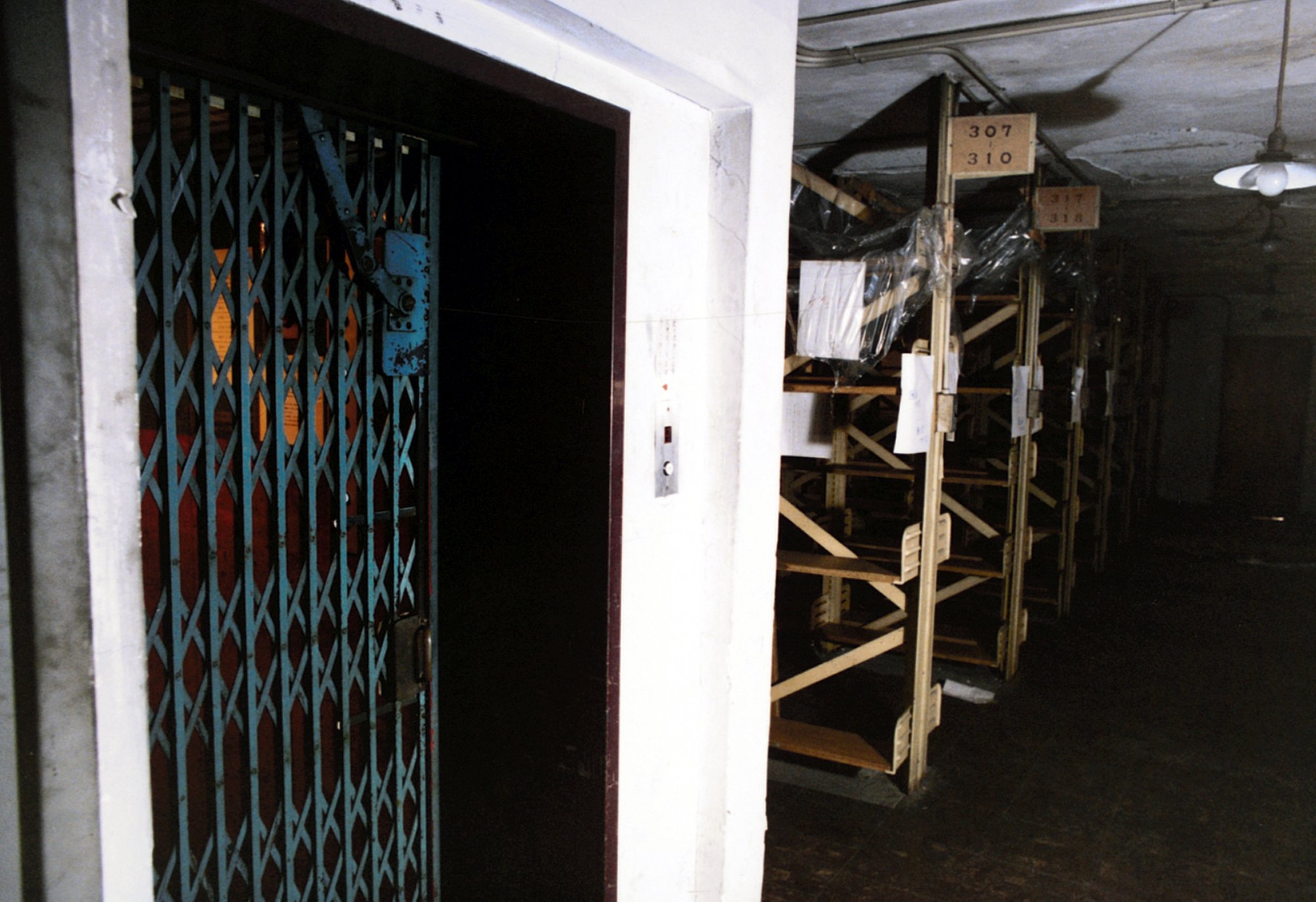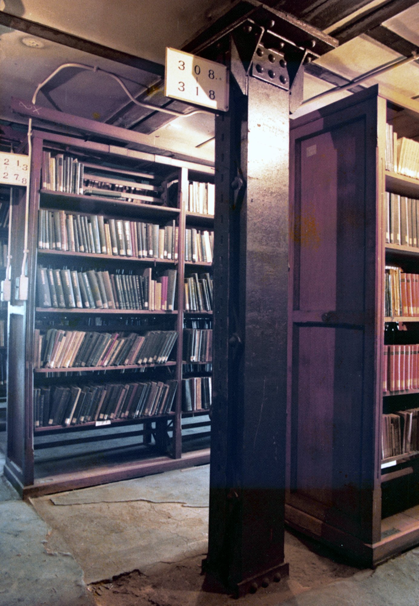 右手に見えるのは、現在は撤去されている書庫用の小型エレベータの設備です。