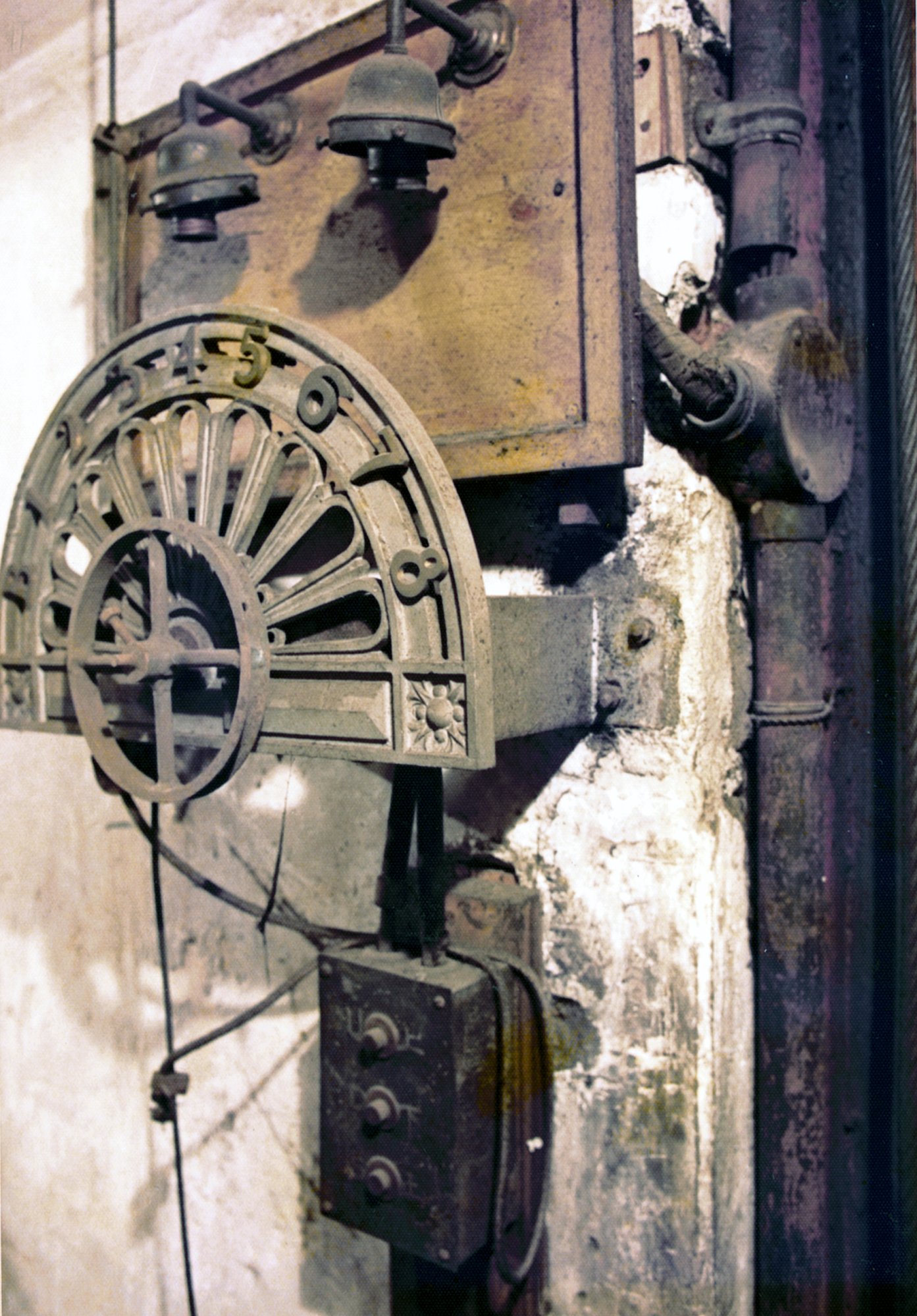現在は撤去された本のエレベータの設備。地階から8層までの表示が見えます。書庫から閲覧室への資料の搬送に使っていました。