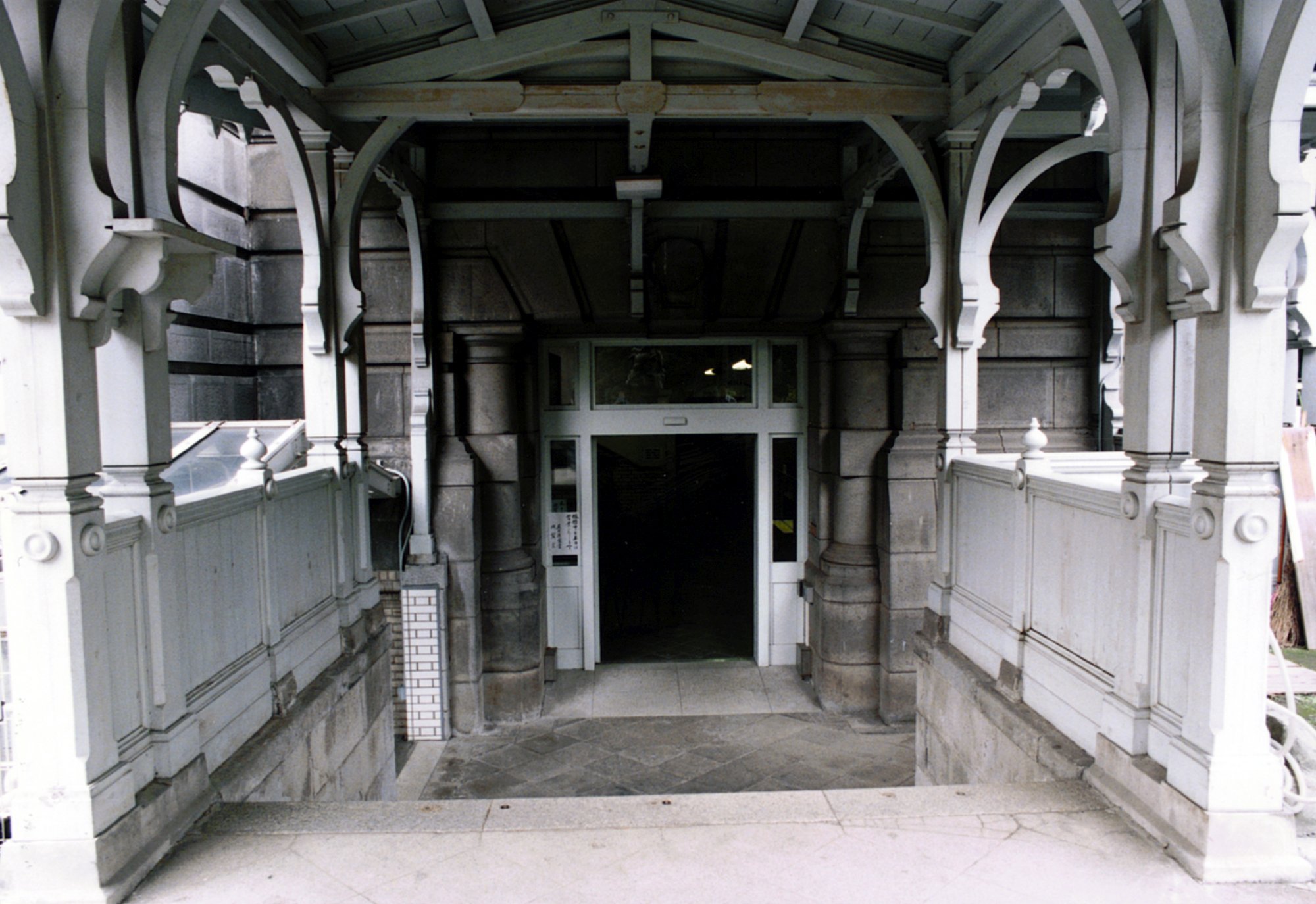 木造の車寄せの雨よけ部分です。奥にある建物は、今はない切符売り場・下足場です。