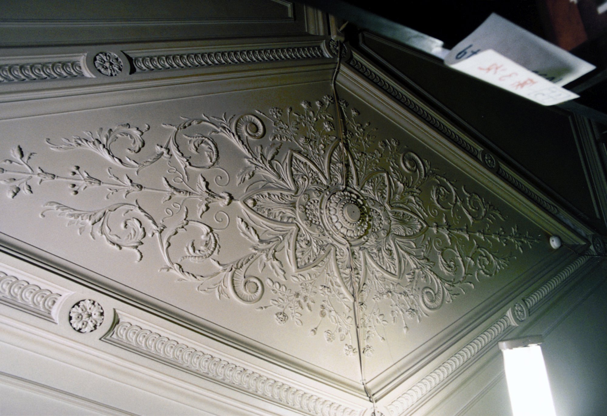 大階段の最上部天井です。館内で唯一、明治期から残っている照明器具です。