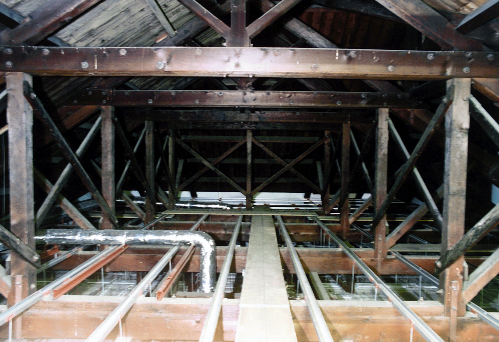 明治期建築部分の屋根裏にある木製小屋組みです。
