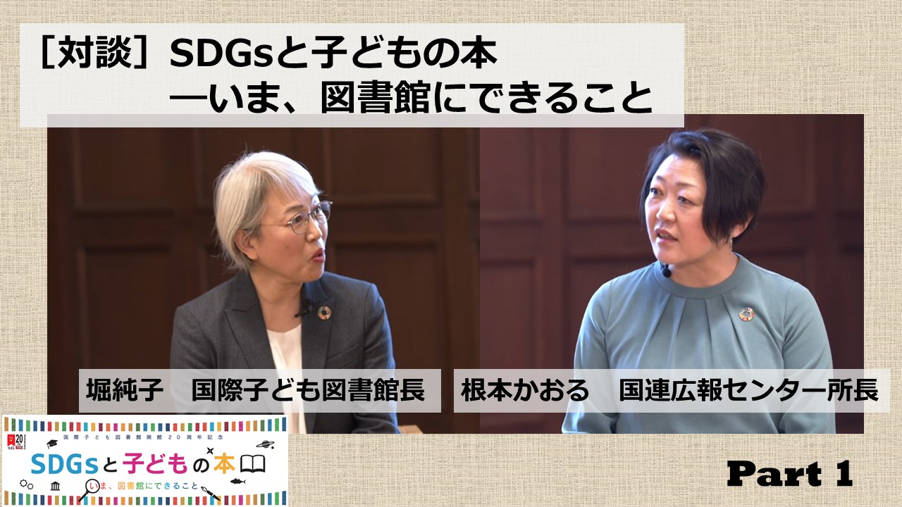 【対談】根本かおる国連広報センター所長・堀純子国際子ども図書館長 Part 1(約16分、YouTubeで開きます。字幕機能を利用して日本語・英語字幕をご利用いただけます)