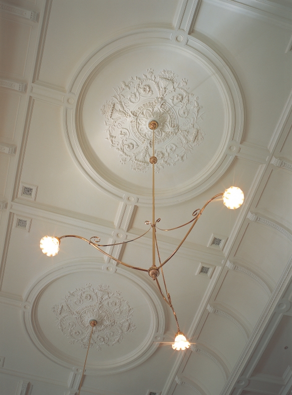 The beautiful plaster moldings on the walls and ceilings of the building date from its foundation. However, after continual renovation over 100 years, the layers of paint which had been put over the plaster had peeled off in places. Therefore, before doing new plasterwork, every bit of the paint had to be removed by hand using chisels and a mechanical hand-grinding tool called "leutor" (trade name).
