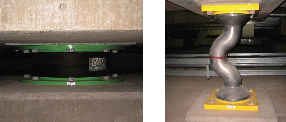 A laminated rubber isolator (left) is a multilayered rubber bearing reinforced with steel plates. It supports the load of the building and has a horizontal elasticity function. The lead damper (right) absorbs the earthquake energy.