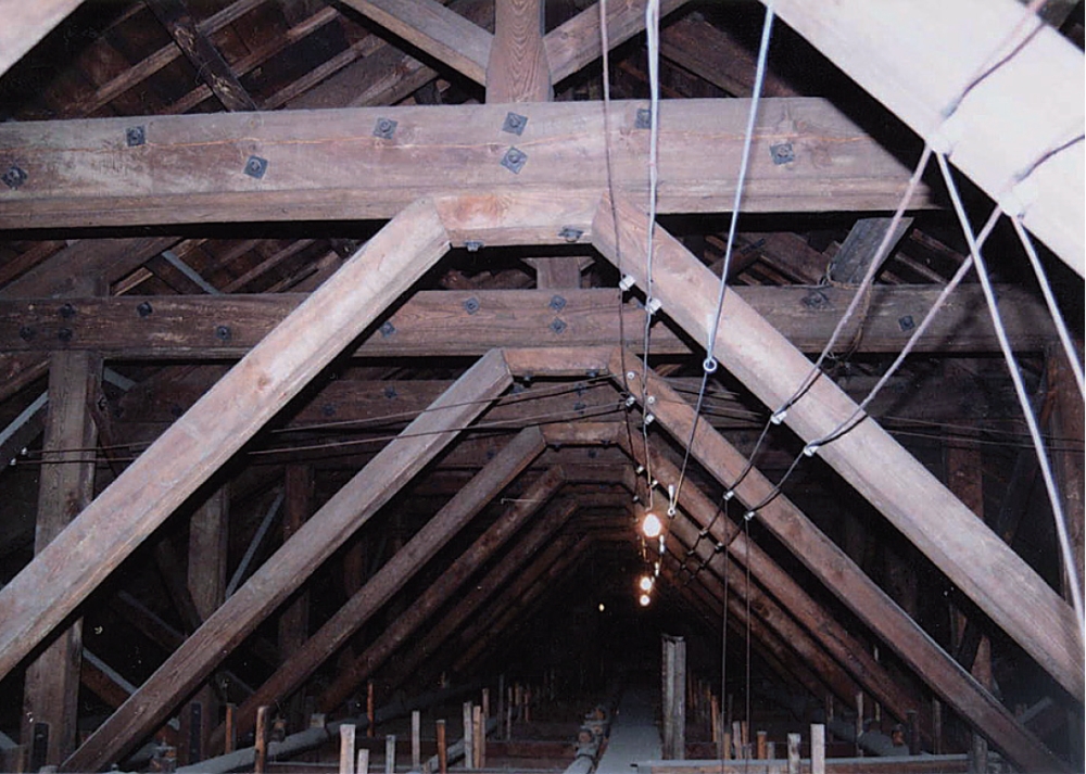 The Meiji-era wooden roof truss and roofboard of the building except for the roof of the stacks have been conserved although these parts cannot be seen from outside.