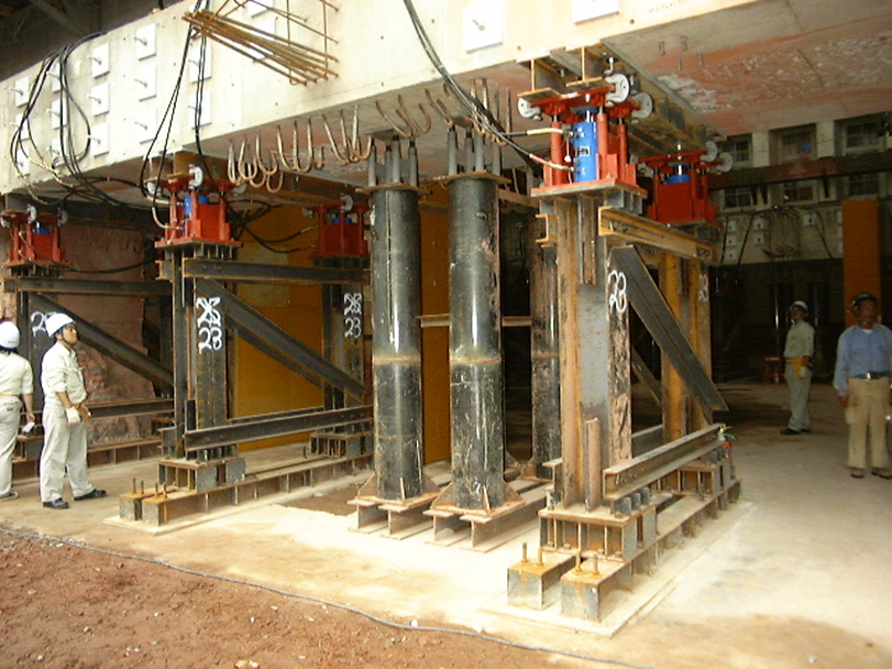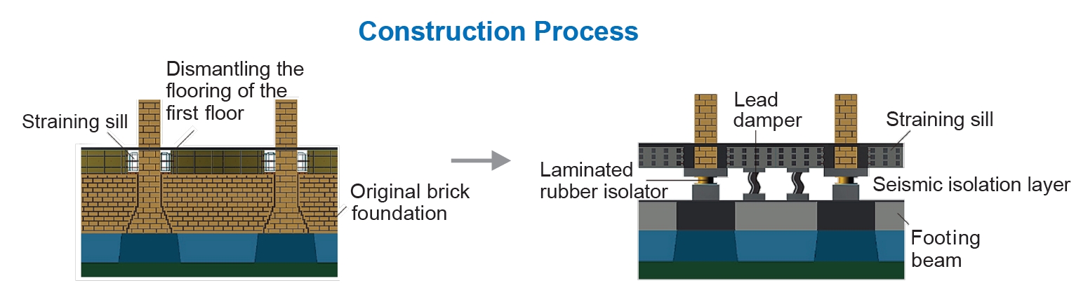 Retrofitting the ILCL was done by the following procedure: 1) remove the first floor; 2) set up straining sills of reinforced concrete so as to sandwich in and tighten up the brick walls until the sills and walls become unified; 3) set up jacks underneath the straining sills to support the all-out weight of the building (approximately ten thousand tons); 4) remove the part of brick walls below the sills and the brick foundation; 5) establish new footing beams of reinforced concrete below; 6) install seismic isolators between the building and the footing beams. When jacking up the building, a computer console was used.