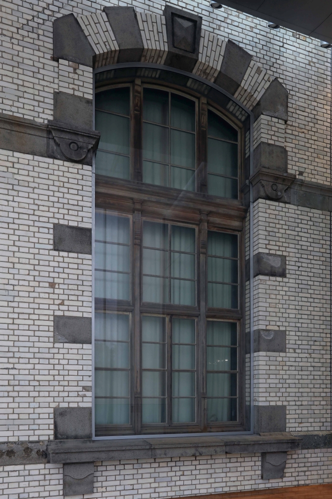 There are no pillars in the Heisei-era part. The omission of pillars has the visual effect of highlighting the bricks and stones of the original building, and at the same time it gives a completely new appearance to the building as a whole, perfectly melding the classic style and modern style.