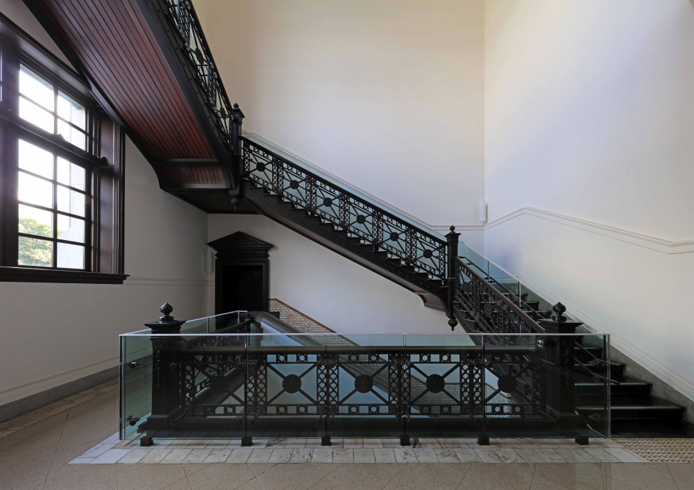The three-story stairwell faces you right after you step into the building. Wood paneling under stairs gives a finished appearance. As the cast-iron staircase handrails are too low to meet modern standards, glass panels have been added in parallel with the restoration of the original iron rails. The Grand Staircase and the corridor to the 2nd floor and the 3rd floor are separated by thick wooden doors made of zelkova, above which there is a glassed-over arch. All the original wooden fittings were repaired and adjusted.