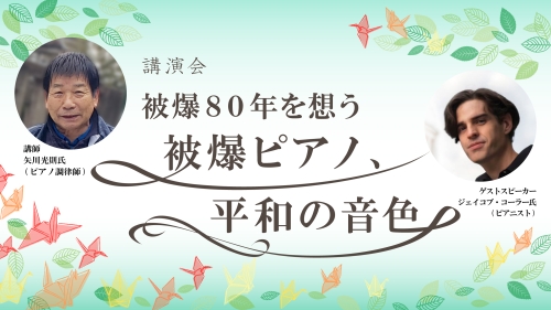 | 講師 | 矢川 光則(やがわ みつのり)氏 1952年広島生まれ。ピアノ調律師。被爆者から「平和の為に役立たせてほしい」とピアノを託されたことをきっかけに、被爆ピアノ全国巡演コンサートを始めた。被爆者から託され修復したピアノ7台により、ニューヨーク、オスロを含む国内外3,500か所以上でコンサートを開催している。著書『海をわたる被爆ピアノ』が2010年に講談社から刊行されたほか、矢川氏をモデルとした映画「おかあさんの被爆ピアノ」が2020年に公開された。 特別ゲストスピーカー:ジェイコブ・コーラー氏 1980年、米国アリゾナ州・フェニックス生まれ。アリゾナ・ヤマハ・ピアノ・コンクールを含む10以上のクラシック・ピアノ・コンクールで優勝後、ジャズクラブでバンド活動を始め、ジャズの才能を開花させた。ジャズ奨学金を受け、アリゾナ州立大学芸術学部ピアノ科で学んだのち2009年に来日。以来、日本で幅広く演奏・作曲活動を行い、被爆ピアノによるコンサートも全国で開催している。 |