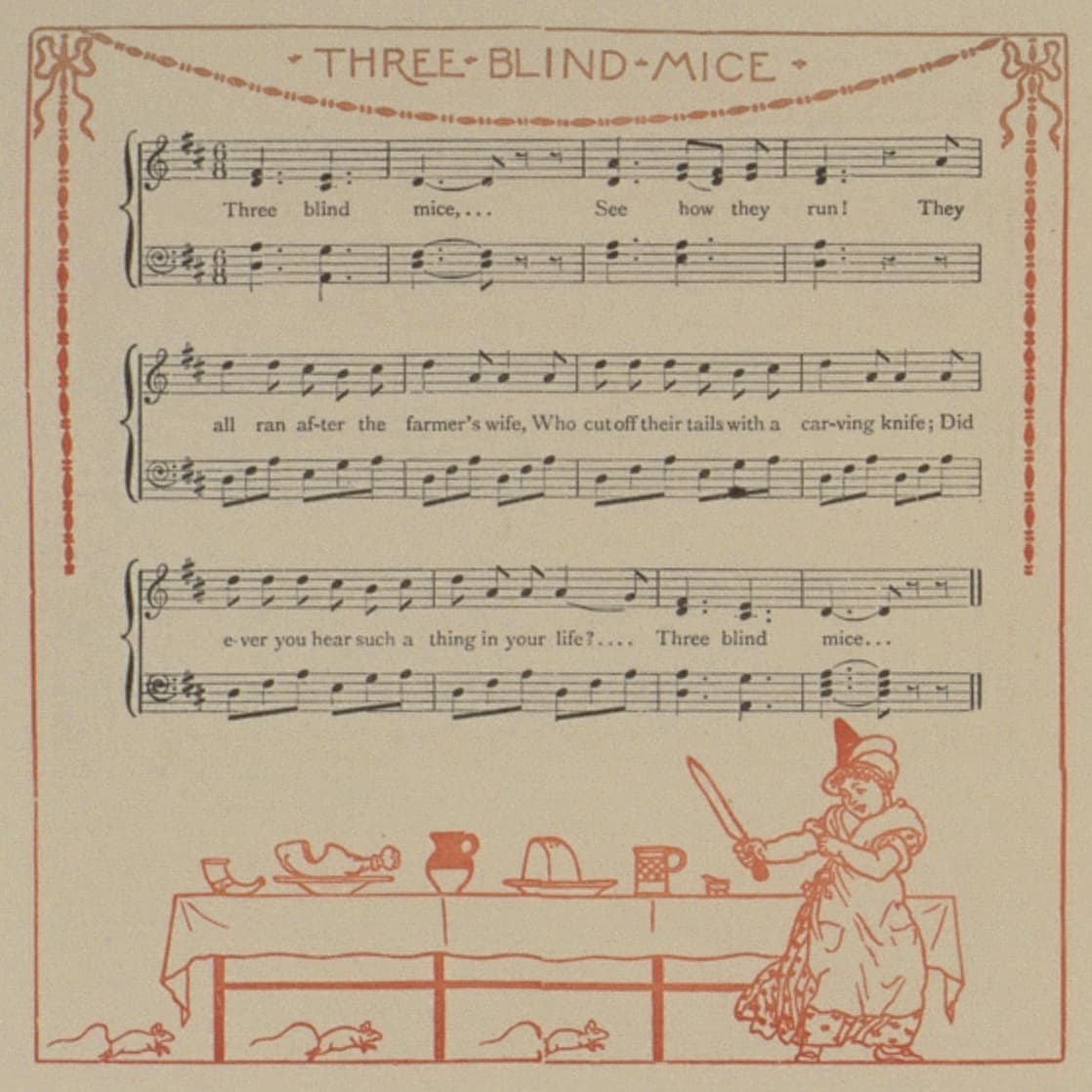 (♪) Three blind mice, See how they run! They all ran after the farmer’s wife, Who cut off thier tails with a carving knife; Did ever you hear such a thing in you life? Three blind mice.