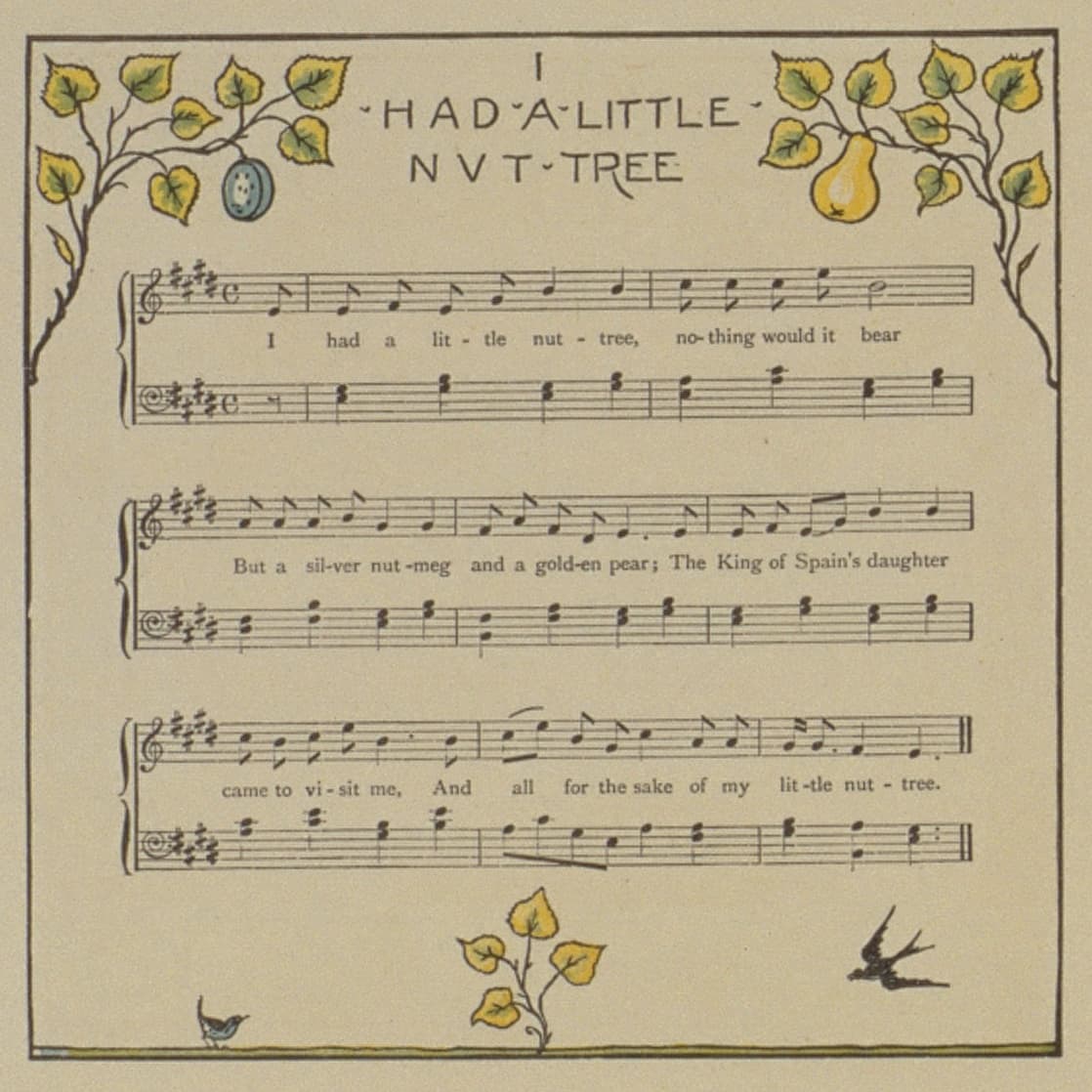(♪) I had a little nut‐tree, nothing would it bear But a silver nutmeg and a golden pear; The King of Spain’s daughter came to visit me, And all for the sake of my little nut‐tree.