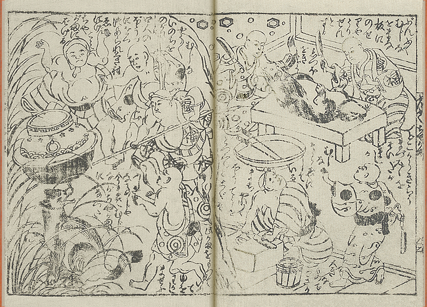 The story familiar today of Bunbuku’s teakettle tells of a raccoon who helps a poor man in return for his kindness. The older version of the tale told in this Edo picture book shows the interactions between a group of saké-loving monks and an old easygoing raccoon. While the book is rather unsophisticated in terms of layout—three scenes taking place at different times stretched across facing pages, pictures and text not well arranged, etc.—it leaves a strangely memorable and heartwarming impression.