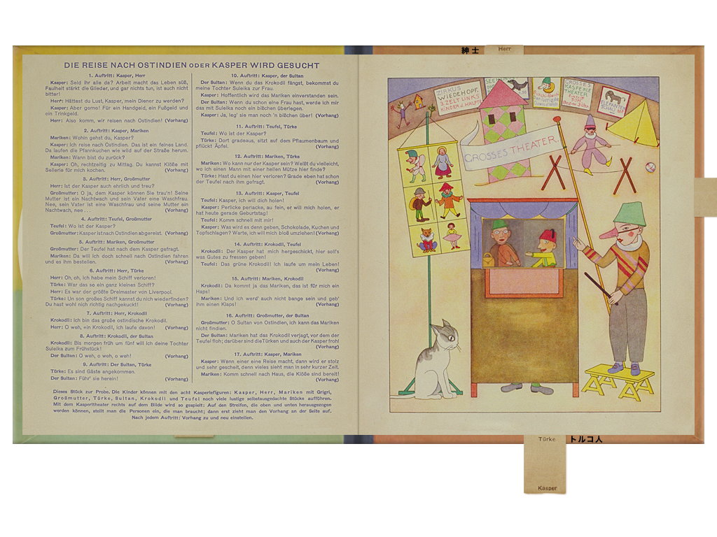 東インド諸島への旅、又は、カスパの捜索。(♪) 第一幕 カスパと紳士。カスパ「コンチワー! みんな居る? 仕事は人生を楽しくするよ。怠け者は太るよ。でも、何もすることがないのが一番さ」 紳士「僕の召使いになりたいかい、カスパ?」 カスパ「もちろんですとも。もし、チップをはずんで下さって、小遣いも下されば」 紳士「それではついておいで! 東インド諸島へ旅に出よう!」